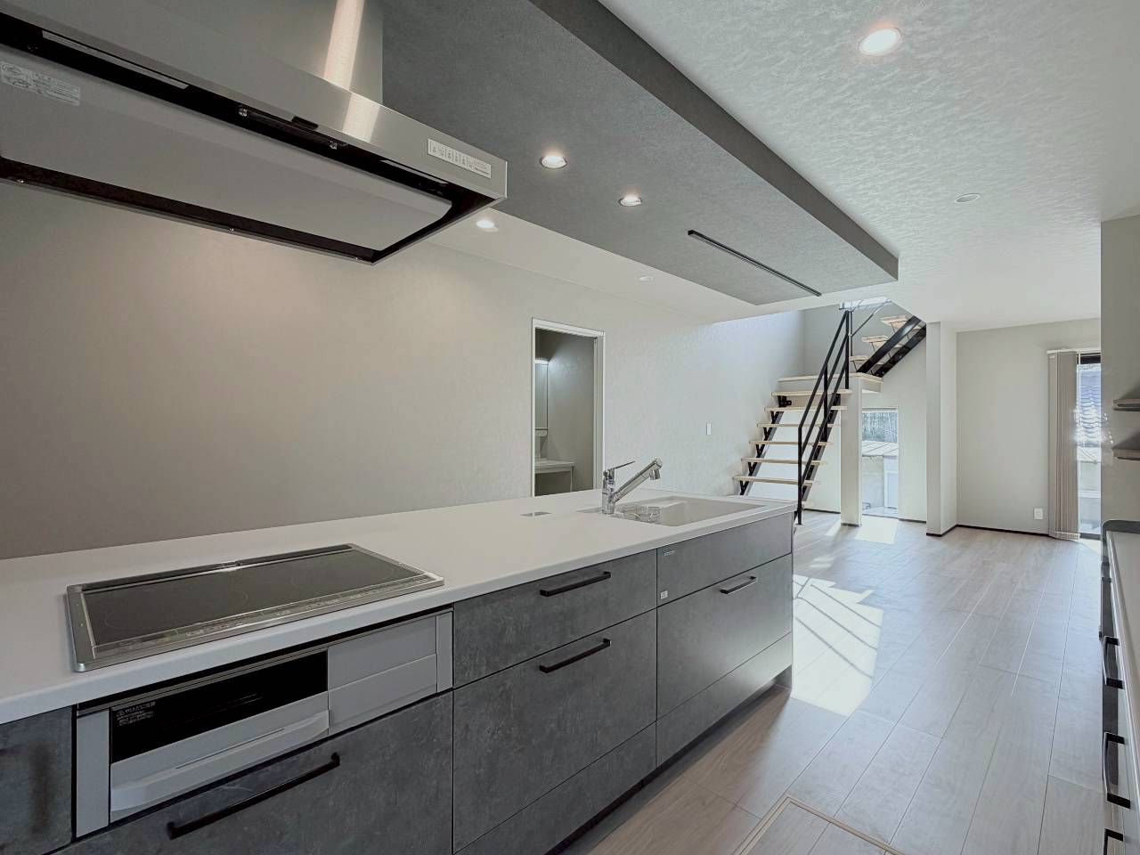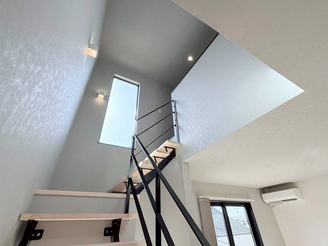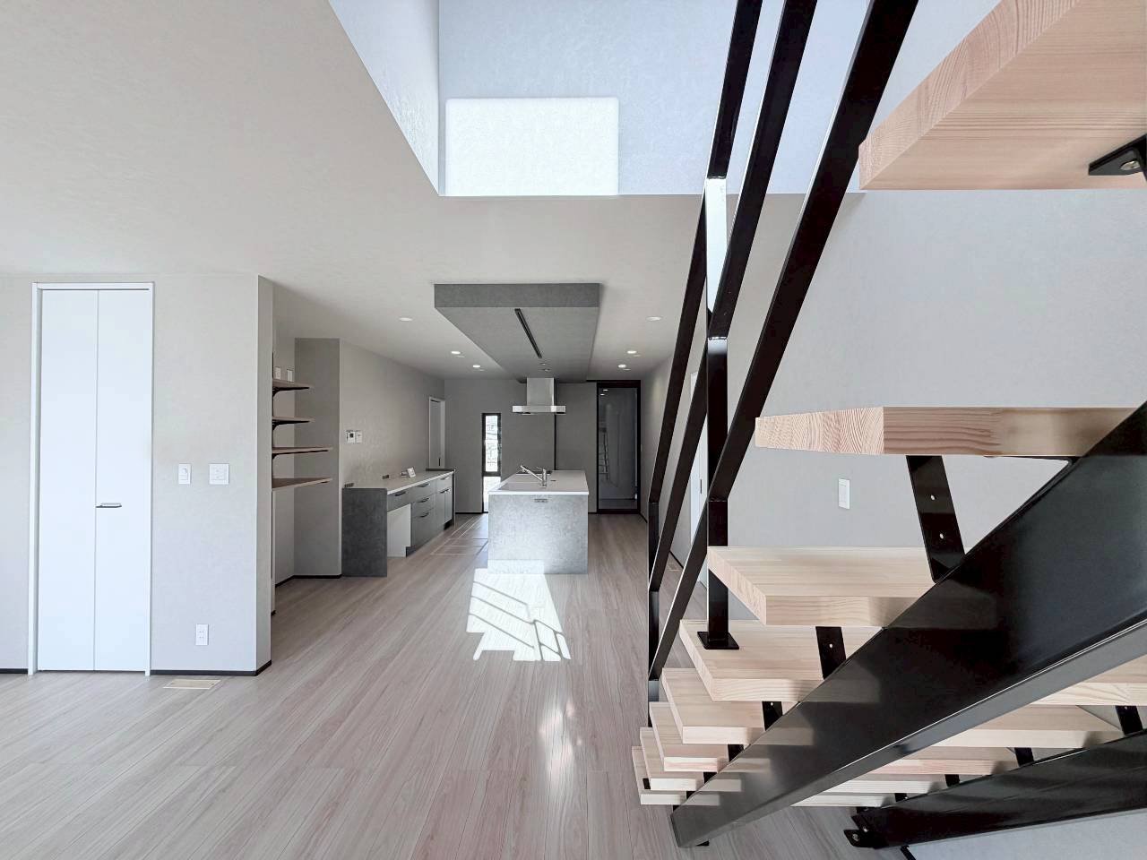 空間の主役となるスケルトン階段が、視線の抜けと軽やかさを生み出し、シンプルな中にも印象的なアクセントを添えています。